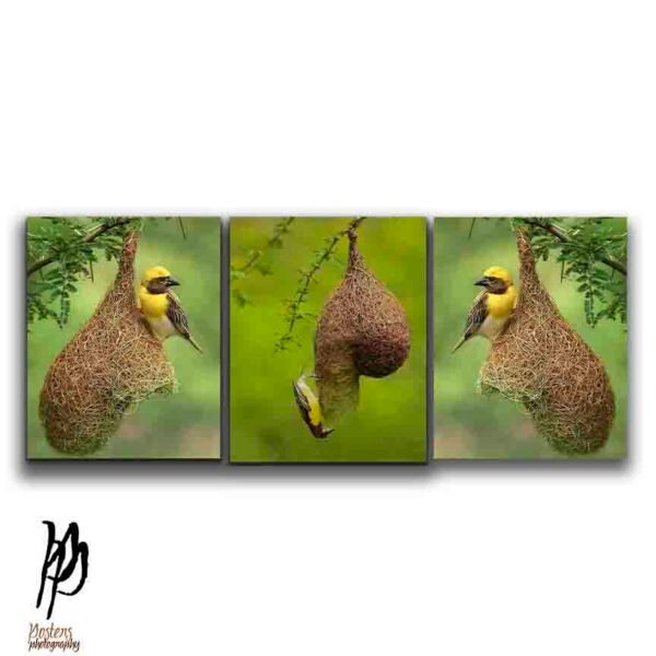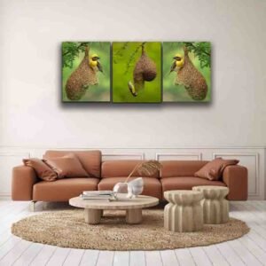 This striking triptych captures the genius of the Baya Weaver in three poetic moments—observation, creation, and devotion. Each panel reveals a different phase of the bird’s instinctive artistry, where every fiber is woven with precision and purpose. Suspended gracefully from thorny branches, the nest becomes more than a home—it is a symbol of resilience, craftsmanship, and nurturing energy.