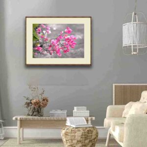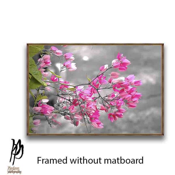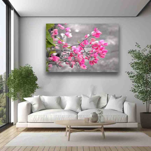 A captivating floral artwork featuring vivid pink blossoms set against a grayscale background. This contrast highlights the delicate beauty of nature, Ideal for living rooms, bedrooms, or office spaces. Perfect piece for modern interiors or gifting.