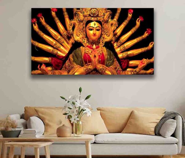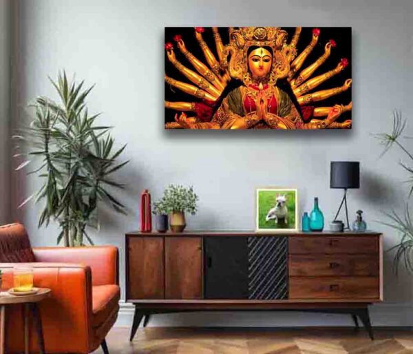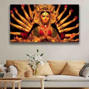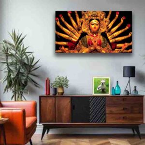 Vibrant Durga poster for Navratri —depicting Maa in full divine form with symbolic weapons and serene power. Ideal for devotional décor, rituals, and festive ambiance. High-quality print with rich colors and traditional detailing. Crafted for spiritual ambiance and visual impact, this poster enhances rituals, bhajans, and darshan during the nine nights of celebration. A must-have for organizers seeking authenticity and aesthetic appeal.