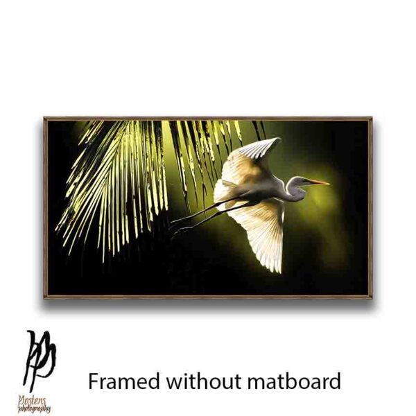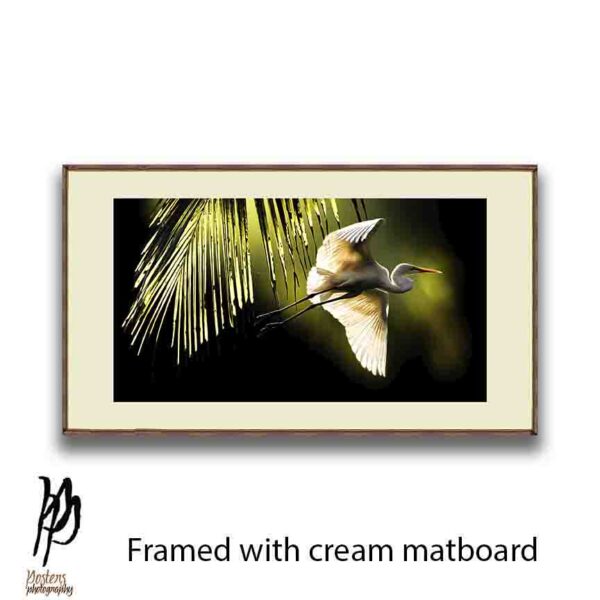 A vision of purity and poise—this captivating photograph features a white egret in mid-flight, its wings bathed in golden light against a deep, dramatic backdrop. The interplay of shadow and sunlight evokes tranquility and motion, making it a timeless piece for nature lovers and art collectors alike. Printed on premium archival paper, this wall art brings the serenity of the wild into your living space. Ideal For home décor, gifting and office spaces.  Tap/click “egrets” to view our egret gallery and “birds” for the birds gallery