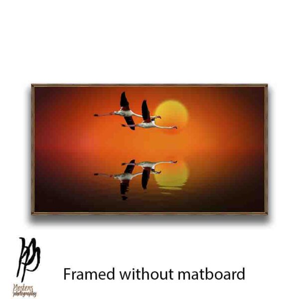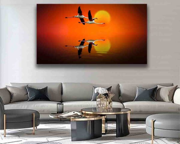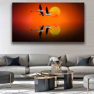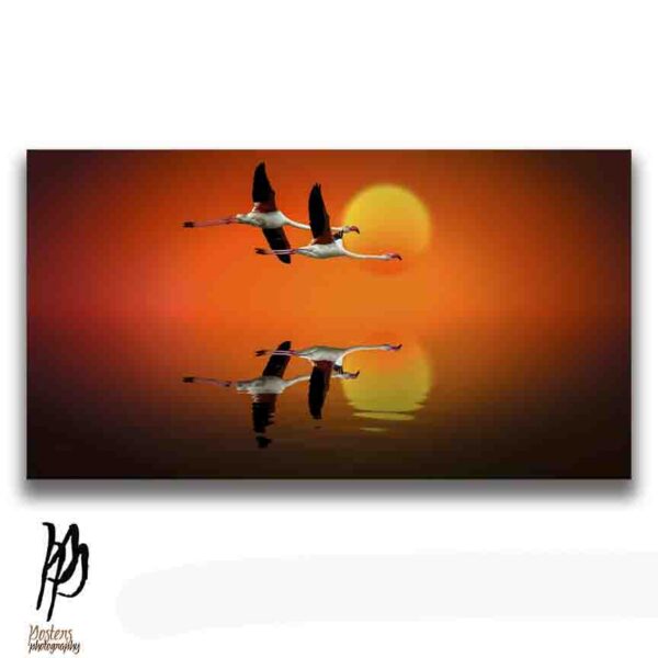 Brinh home the poetry of nature with this stunning wall poster featuring two flamingos gliding over tranquil waters at sunset. The warm amber hues and perfect reflections evoke peace, elegance, and timeless beauty. Ideal for living rooms, bedrooms, or creative spaces, this high-quality print adds a touch of sophistication and calm to any décor. Perfect for gifting or personal décor