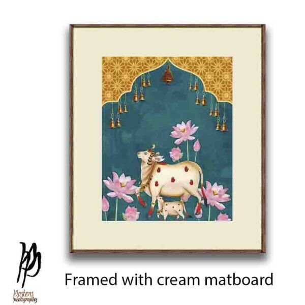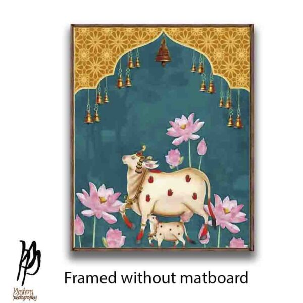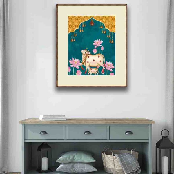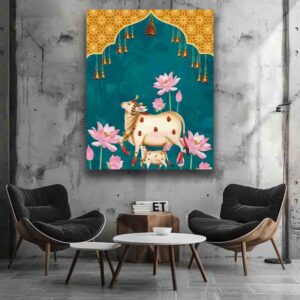 Bring home the essence of Indian tradition with this beautifully crafted wall art featuring a sacred cow and calf surrounded by blooming lotus flowers. The cow is adorned with symbolic red handprints and traditional jewelry. This artwork reflects themes of divinity, peace, and cultural heritage—perfect for your living room, puja space, or gifting during festivals.