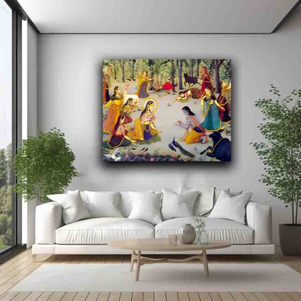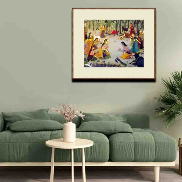This evocative wallart poster captures the poignant moment when Udhav, the cousin and messenger of Krishna, arrives in Vrindavan to console the Gopis. Surrounded by forest serenity, sacred animals, and the aching devotion of the women, the scene radiates spiritual intensity and emotional depth. A rare depiction of divine dialogue and longing, this wall art is ideal for collectors of mythological art, seekers of Bhakti narratives, and lovers of Indian heritage.