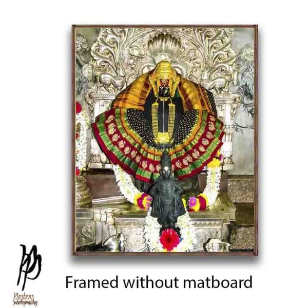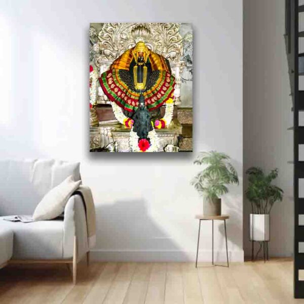 Goddess Mahalakshmi in her Kolhapur sanctum form, adorned with traditional saree drapery in auspicious reds and greens, and crowned with intricate gold ornaments. Set against a silver-embossed backdrop of divine motifs, the idol radiates serenity and power. Floral garlands and ceremonial offerings evoke the living devotion of temple rituals, making this piece a timeless tribute to sacred heritage.