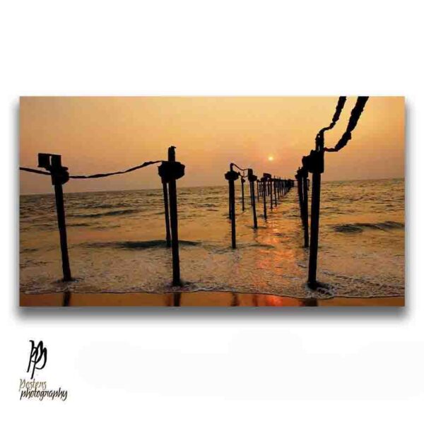 Archival fine art Giclee print of lovely Kozhikode beach sunset – The fisher boat anchor poles creating a runaway to the setting sun!