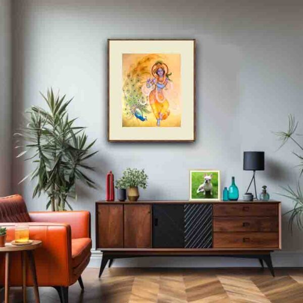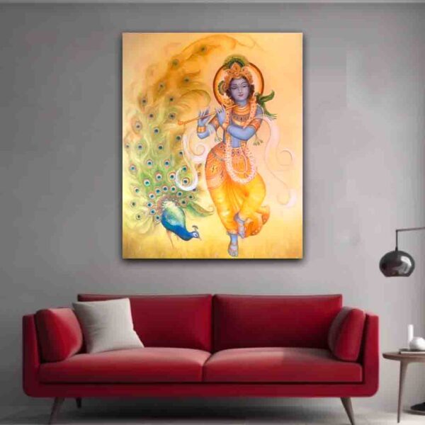 Lord Krishna, standing in the classic tribhanga pose with one leg crossed over the other. playing his flute.  Behind him is a magnificent peacock, its feathers fanning out in a dazzling display of green, blue, and gold. The warm golden background radiates a soft glow, enhancing the ethereal and spiritual aura of the scene, making it perfect for a devotional poster or wall art.  Tap click tag ‘krishna” to view our Krishna gallery.
