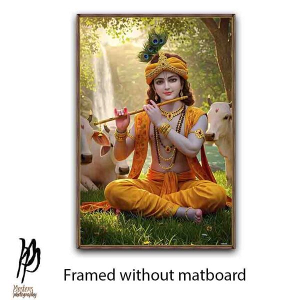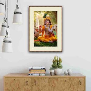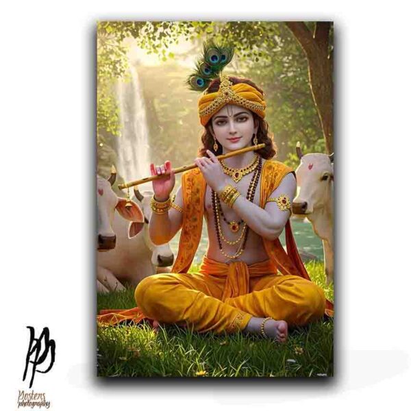 Divine Krishna Playing Flute – Spiritual Wall Art with Sacred Surabhi Cows & Scenic Nature.