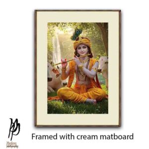 Immerse your space in tranquility with this beautifully detailed fine art giclee print of Lord Krishna, seated amidst lush greenery and sacred cows, playing his golden flute. Adorned with traditional jewelry and a peacock-feathered crown, Krishna radiates peace and divinity in this pastoral setting. Perfect for meditation rooms, spiritual corners, or as a meaningful gift, this piece captures the essence of devotion and harmony.