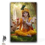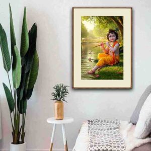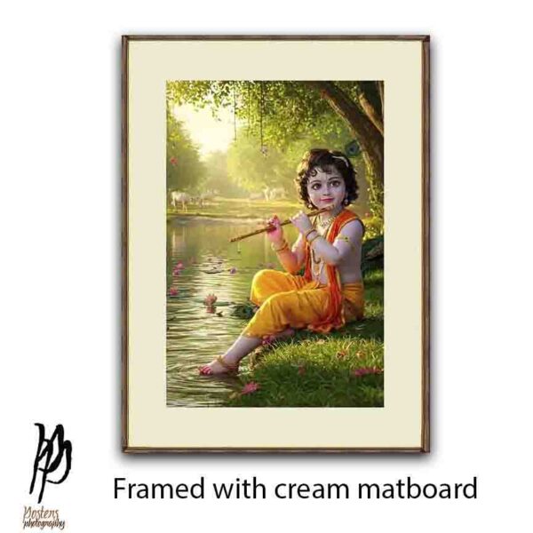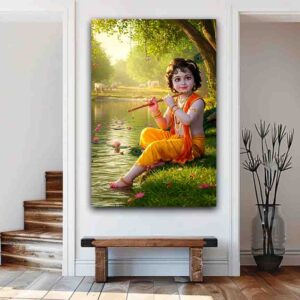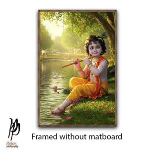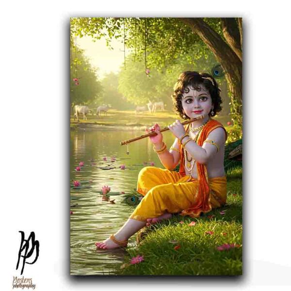 Bring serenity and tradition into your space with this enchanting fine-art giclee print of Bal Krishna. Dressed in vibrant yellow and orange attire, adorned with gold jewelry and a signature peacock feather, he sits peacefully by a lotus-filled riverbank, playing the flute. Surrounded by lush greenery and grazing cows, this pastoral scene radiates divine charm and tranquility.