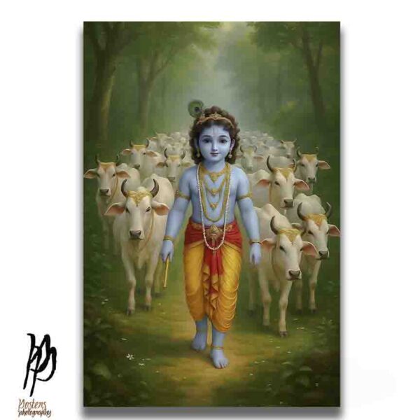 Graceful depiction of Lord Krishna walking through in a lush forest, surrounded by divine cows. The forest backdrop, with its towering trees and vibrant greenery, enhances the spiritual ambience of the scene. A perfect poster for devotees, art collectors, or anyone seeking a touch of divine tranquility in their space. Ideal for enhancing positive energy in your home per Vastu. Tap/click tag “krishna“ to view our Krishna gallery.