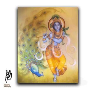 Immerse your space in serenity with this timeless depiction of Lord Krishna, the beloved deity of love and compassion. Captured in a tranquil forest setting, Krishna stands gracefully playing his flute, adorned in traditional yellow dhoti and peacock feather crown. Surrounded by sacred cows and a vibrant peacock, this artwork evokes the pastoral charm of Vrindavan and the divine essence of Hindu spirituality. A soft golden glow enhances the peaceful aura, making it a perfect addition to any home, temple, or meditation space. Ideal for devotees, art collectors, or anyone seeking a touch of divinity in their decor. Tap/click tag “krishna“ to view our Krishna gallery.