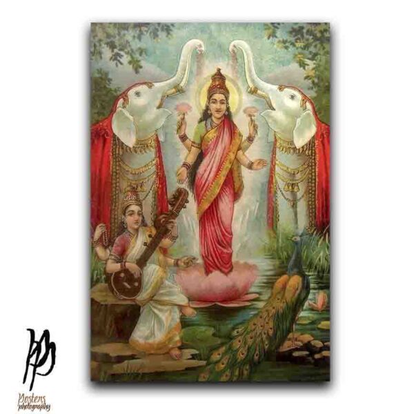 Famous Ravi Varma Painting of Goddess Laxmi (goddess of wealth) standing on the Lotus Flower with Goddess Saraswati (Goddess of Knowledge) playing the Veena as a fine art print. Tap/click “laxmi” to view our Goddess Laxmi gallery and “Saraswati” to view out Goddess Saraswati gallery