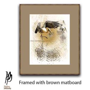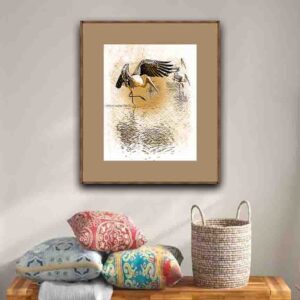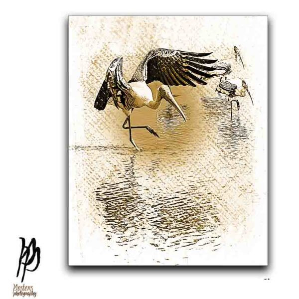Amazing Fine art graphic print a solitary stork striding across shimmering waters, its wings mid-motion—poised between flight and stillness. The textured sepia tones and the reflection ripples below echo nature’s quiet rhythm. A second bird in the background adds depth, suggesting companionship in solitude.
