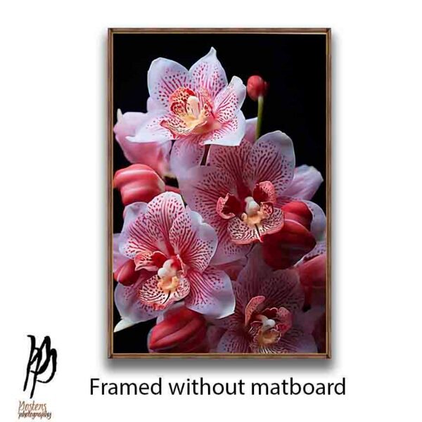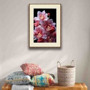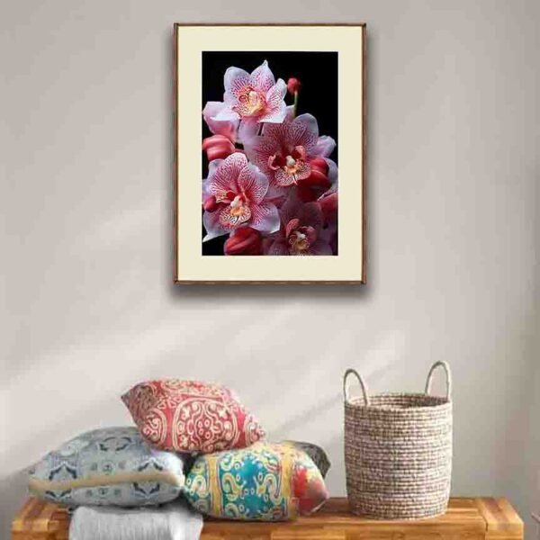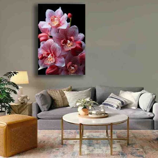 This elegant artwork captures the soft blush tones of pink and white orchids, detailed with natural speckles and a warm golden center. The dark background enhances the flower’s purity, making it a luxury botanical statement piece for any modern interior. Perfect for homes that seek calmness, beauty, and refined floral aesthetics, this orchid artwork brings a touch of serenity and sophistication to your space. Ideal for those who love minimal, elegant floral décor