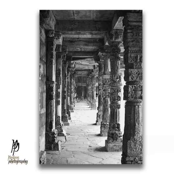 Fine Art black and white photographic wall poster of the pillars Pillars in Quwwat-ul-Islam Mosque in Lucknow, India. This is probably the oldest mosque in North India. It was built by Qutb-ud-Din Aibak and he used material from the Hindu and Jain temples they destroyed. That’s why the pillars are ornate and have Hindu motifs on them. You can spot Kalash, ghanti, yakshini and many other Hindu motifs.