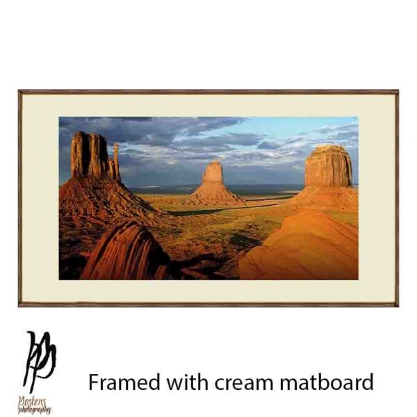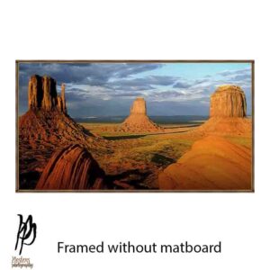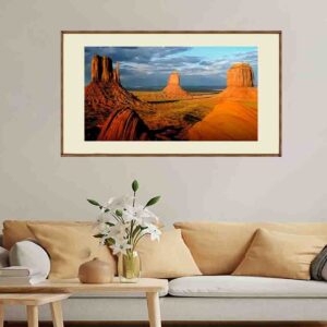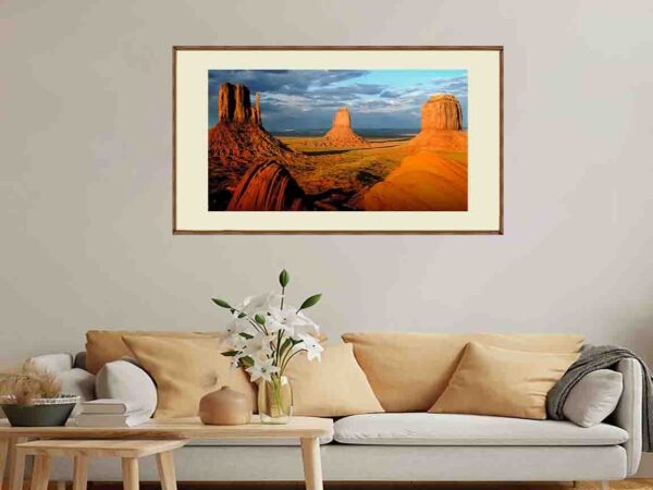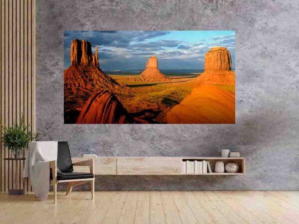 Bring the raw beauty of the American Southwest into your space with this breathtaking landscape artwork inspired by the iconic sandstone buttes of Monument Valley. Bathed in warm golden light beneath dramatic, cloud-filled skies, this image captures the vastness, serenity, and timeless power of the desert.