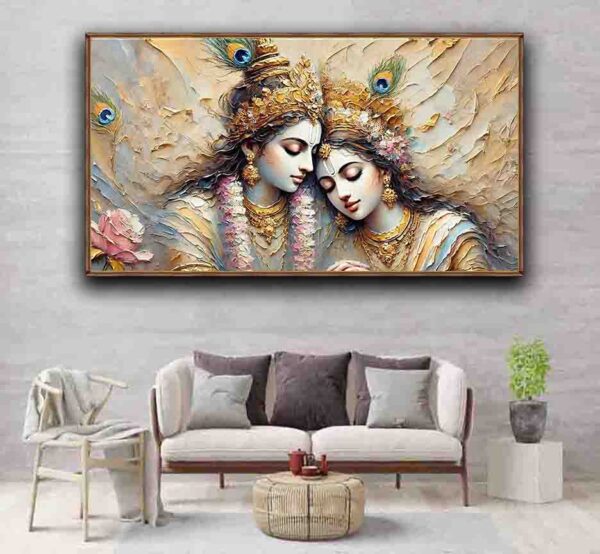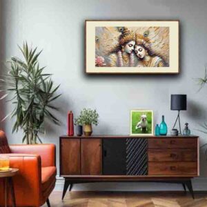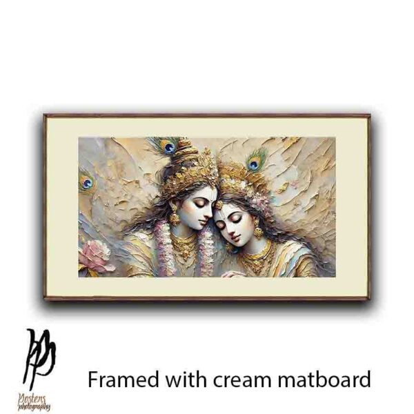 A luminous portrayal of divine love, this fine art giclee captures Radha and Krishna in a moment of tender closeness, adorned in regal attire and crowned with peacock-plumed halos. Their serene expressions and intricate gold embellishments evoke timeless devotion and romantic grace. Ideal for collectors of spiritual art, this piece brings warmth, beauty, and sacred symbolism to any space. Tap/click on tag “krishna” and “radhakrishna” to see more art posters of Lord Shri Krishna. and radhakrishna respectively.