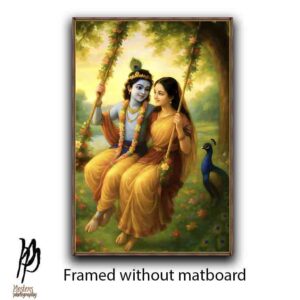 Celebrate eternal love with this enchanting portrayal of Radha and Krishna on a floral swing, nestled in a lush riverside grove. Krishna’s serene blue form and peacock crown meet Radha’s golden grace in a moment of divine intimacy. Perfect for collectors of spiritual art, this piece radiates harmony, romance, and the timeless charm of Vrindavan. Tap click tag ‘krishna” to view our Krishna gallery and “radhakrishna” for the Radha Krishna gallery