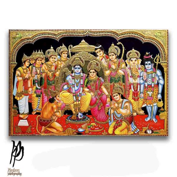 Fine art Giclee of a Tanjore painting of the Ram Darbar the divine court of Lord Ram and the perfect union of love, duty, loyalty, and righteousness. The Ram Darbar is also an attractive representation of Lord Vishnu and his family. Lord Rama is the seventh incarnation of Lord Vishnu, and his wife Sita is his perpetual consort, the embodiment of love and virtue. Everyone should have a Ram Darbar poster in their homes, so that they can remind ourselves of the great devotion and love that these men have shown to one another.