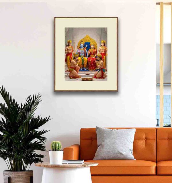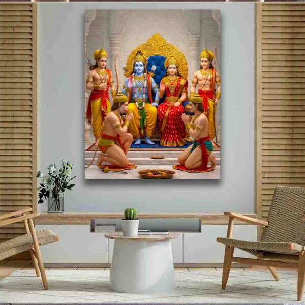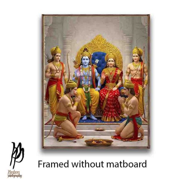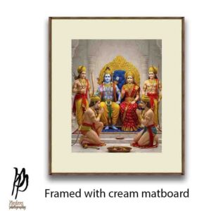 The Poster of Lord Rama, his consort Sita, with Hanuman and Laxman is highly symbolic of devotion, love, and friendship. It symbolizes a home where each member of the family is loved and cared for. The Ram Darbar consists of Lord Ram, Lord Laxman, Maa Sita, and Lord Hanuman. Each one represents a different quality of life. Everyone  should have a Ram Darbar poster in their homes, so that they can remind ourselves of the great devotion and love that these men have shown to one another. The Ram Darbar is an attractive representation of Lord Vishnu and his family. Lord Rama is the seventh incarnation of Lord Vishnu, and his wife Sita is his perpetual consort and the embodiment of love and virtue. Tap/click tag “ram_darbar” to view our Ram Darbar gallery and “rama” for the Lord Rama Gallery.
