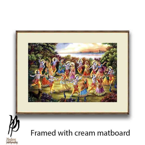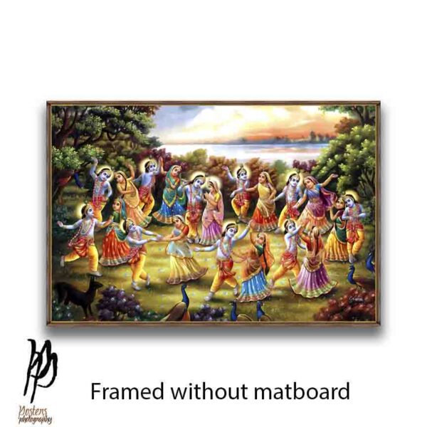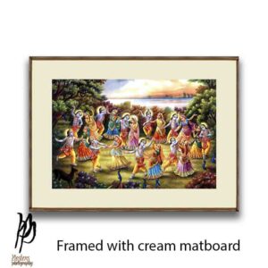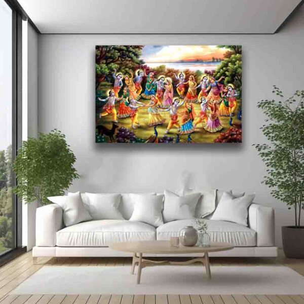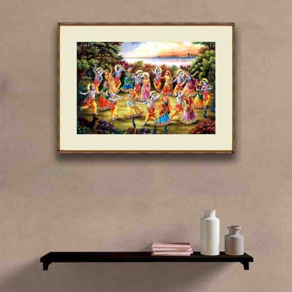 A timeless portrayal of the Ras Lila, where Krishna, Radha, and the gopis dance in divine harmony. Rich colors, intricate detailing, and a serene landscape evoke joy, devotion, and spiritual beauty.A must for Krishna Art collectors, perfect for living room or wherever it may be hung,