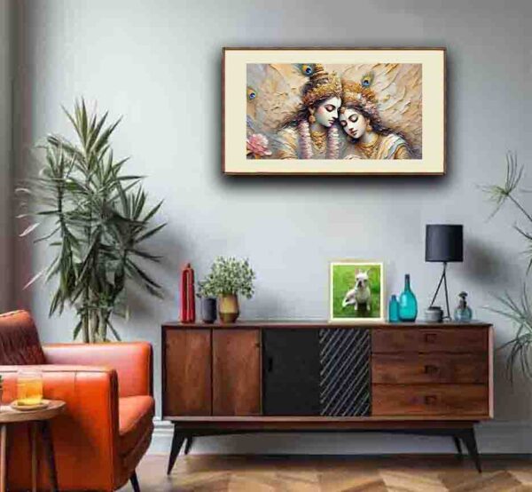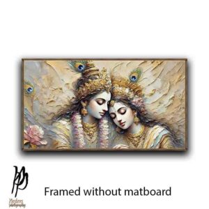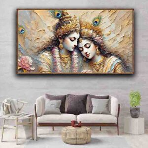 Celebrate the timeless romance of Radha and Krishna with this evocative wall art, featuring intricate detailing and soft, serene tones. Adorned in traditional attire and crowned with peacock feathers, the divine couple rests in a tender embrace—symbolizing spiritual union and eternal love. Perfect for living rooms, meditation spaces, or gifting, this artwork blends mythological grace with contemporary elegance. Printed on high-quality material for lasting vibrance, it brings warmth and devotion to any corner of your home.