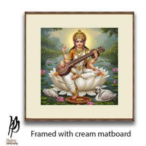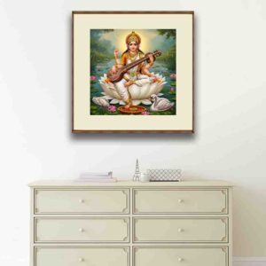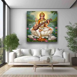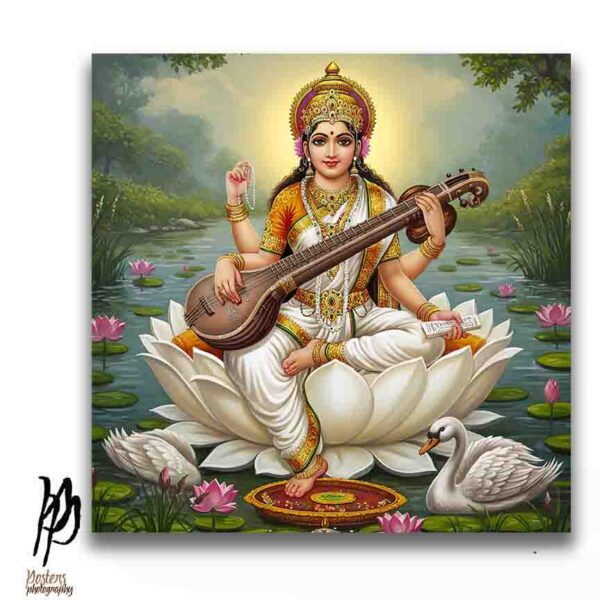 Celebrate wisdom, music, and serenity with this exquisite traditional artwork of Goddess Saraswati. Seated gracefully on a blooming white lotus, she plays the veena amidst a tranquil pond, surrounded by swans and lush greenery. Adorned in ornate gold jewelry and a radiant crown, her divine presence is captured in vivid detail. Perfect for homes, educational institutions, or as a gift to inspire learning and creativity.