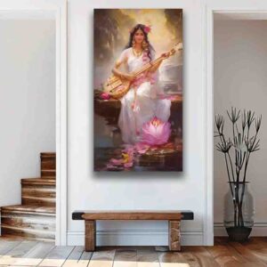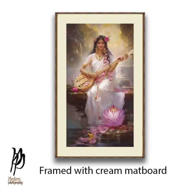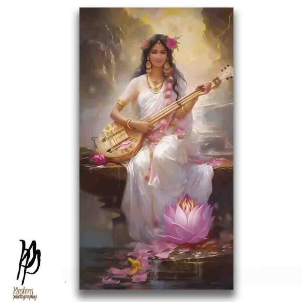 Gracefully seated by a tranquil pond, this exquisite portrayal of Goddess Saraswati radiates serenity and wisdom. Dressed in a flowing white saree adorned with soft pink florals, she plays a veena embellished with golden motifs, her presence framed by blooming lotuses and gentle light. A symbol of music, learning, and divine grace, this artwork blends classical iconography with ethereal charm—perfect for collectors of spiritual art, temple-inspired décor, or lovers of Indian heritage. Tap/click “saraswati” to view more posters of Saraswati