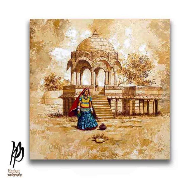 Fine art print of a Rajasthani art painting titled “The Woman and the Cenotaph”